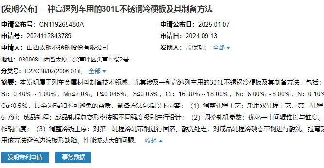 2025年1月7日,山西太鋼不銹鋼股份有限公司成功申請(qǐng)一項(xiàng)名為“一種高速列車用的301L不銹鋼冷硬板及其制備方法”專利,申請(qǐng)公布號(hào)為CN119265480A,申請(qǐng)日期為2024年9月13日。